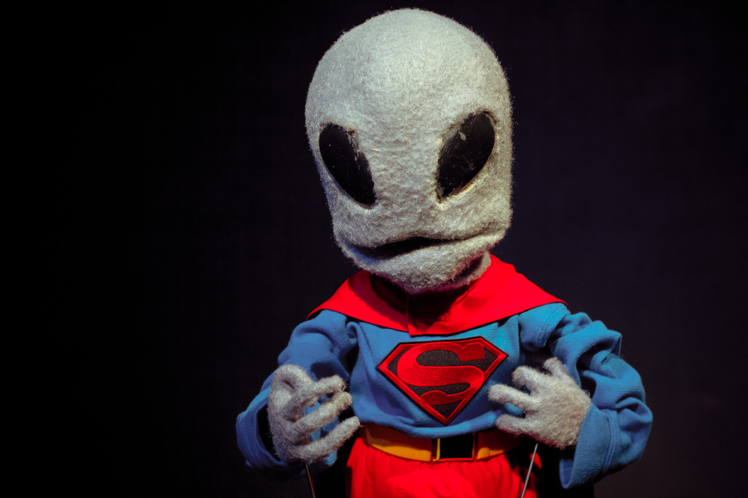 Years ago, i built a Grey Alien puppet that we wound up naming Martin. After some refining, we made a short film where he starred as Superman. These were test shots taken in 2019 to see how he would look in his costume as both Clark Kent AND Superman. (Photos by Nikki Loehr. Puppeteer: Sam Locke)